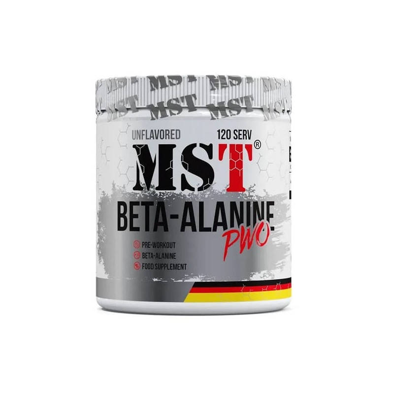 Спортивна добавка Beta-Alanine PWO від популярної німецької компанії MST – потужний амінокислотний продукт, представлений у вигляді розчинного порошку з нейтральним смаком. Його основною діючою речовиною є бета-аланін, нутрієнт, що відповідає за стан та працездатність м'язів.