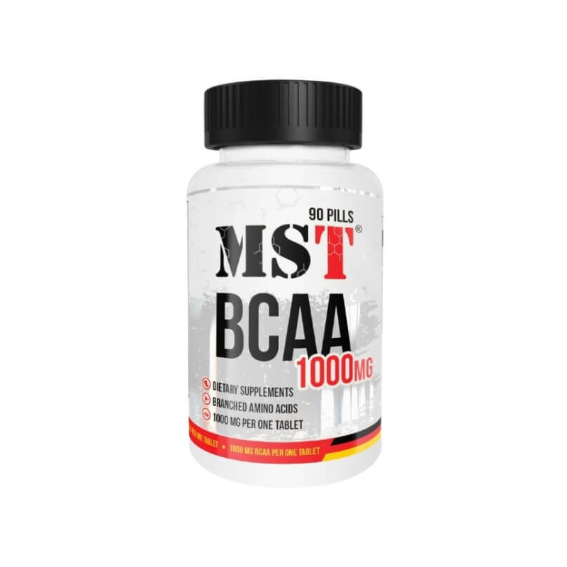 BCAA 1000 від виробника спортивного харчування з Німеччини MST – чистий збалансований комплекс найбільш значимих незамінних амінокислот у таблетках. У ньому присутні такі важливі нутрієнти як лейцин, ізолейцин і валін у адаптованій L-формі, що легко засвоюється, у стандартній пропорції 2:1:1.