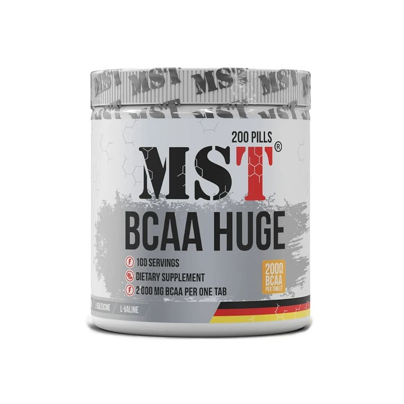 Біоактивна добавка BCAA Huge від німецького виробника MST – комплекс амінокислот БЦАА, представлений у чистому вигляді. Оптимальна пропорція лейцину, ізолейцину та валіну – 2:1:1 – дозволяє забезпечити організм дорослої людини необхідною кількістю найважливіших для життєдіяльності незамінних амінокислот. Харчова добавка пропонується споживачеві у формі зручних прийому таблеток невеликого розміру.