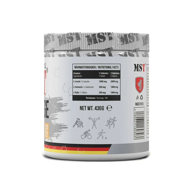 У добовій порції спортивної добавки BCAA Huge від MST, що складається з 2 таблеток, міститься: