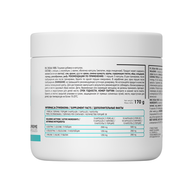 Відмінна харчова добавка, розроблена спеціально для спортсменів. Зручний форм-фактор (у вигляді капсул) забезпечує простий прийом. Препарат містить оптимальне співвідношення амінокислот з розгалуженими боковими ланцюжками-2 до 1 до 1, і ідеально підходить для підтримки організму атлетів і спортсменів, що вважають за краще силові вправи.