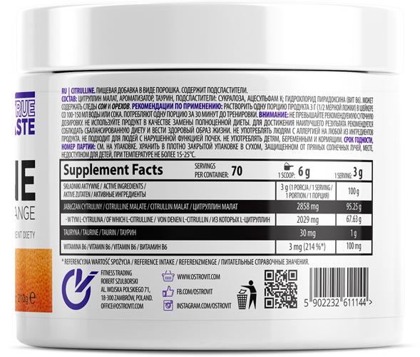 Спортивна добавка Ostrovit Citrulline на базі цитрулина малата з вітаміном В6 і таурином-кращий вибір для підтримки організму під час тренувань і підвищення працездатності і витримки. До складу добавки входить яблучна кислота, яка в поєднанні з цітрулін забезпечує високу засвоюваність амінокислоти.