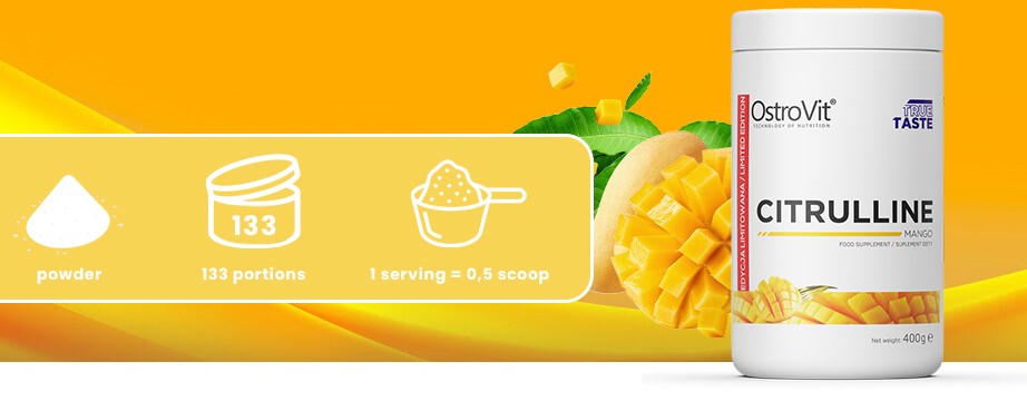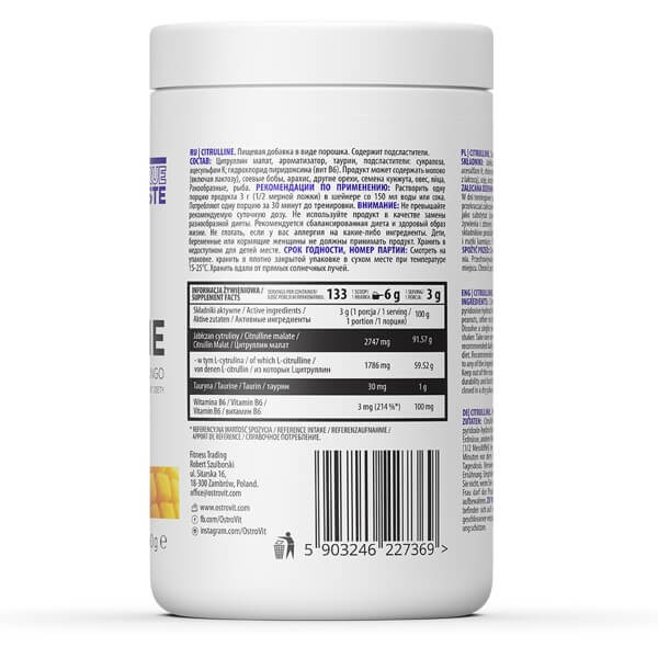 Спортивна добавка Ostrovit Citrulline на базі цитрулина малата з вітаміном В6 і таурином-кращий вибір для підтримки організму під час тренувань і підвищення працездатності і витримки. До складу добавки входить яблучна кислота, яка в поєднанні з цітрулін забезпечує високу засвоюваність амінокислоти.
