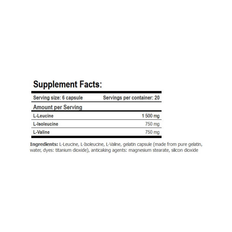У добовій порції біодобавки BCAA Elite Rate від Amix із 6 капсул міститься: