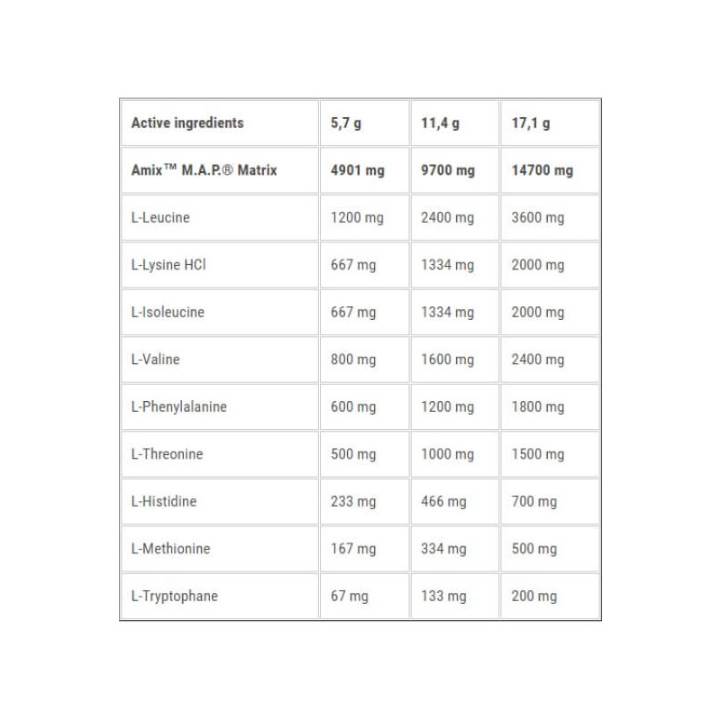 У порції амінокислотної добавки Amixprо M.A.P. від Amix масою в 5,7 г міститься: