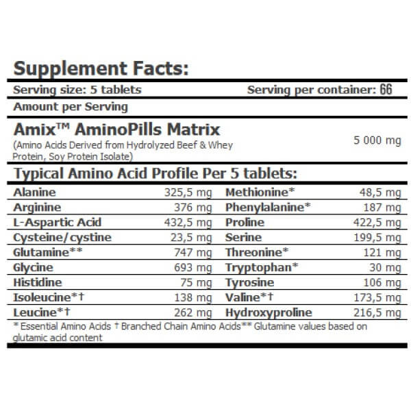 У порції біоактивної добавки Amino Pills від Amix з 5 таблеток міститься: