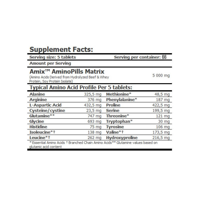 Amino Pills від легендарного британського бренду Amix – революційний комплекс із 18 найбільш важливих для життєдіяльності організму амінокислот, у тому числі всіх восьми незамінних. Він представлений у вигляді унікальної запатентованої матриці Amino Pills. Активні інгредієнти для біодобавки отримують відразу з декількох видів сировини – у виготовленні продукту використовується гідролізована яловичина, молочна сироватка та соєвий ізолят. Це дозволяє досягти ідеального амінокислотного профілю та принести організму максимум користі.