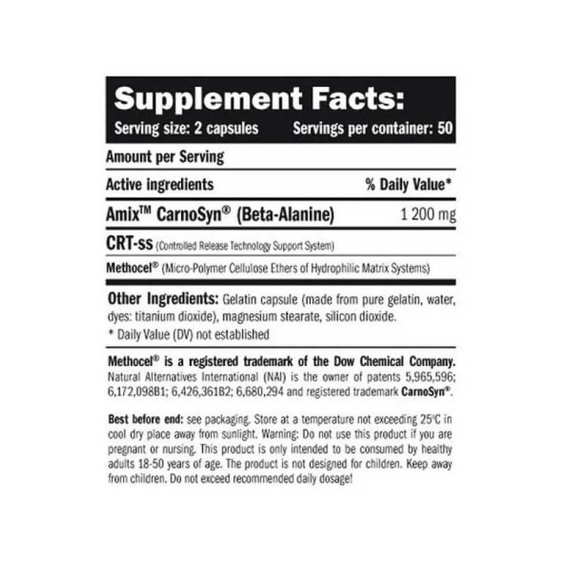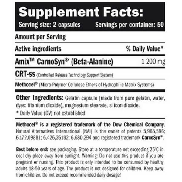 У порції харчової добавки Beta Alanine CarnoSyn від Amix з 2 капсул міститься:
