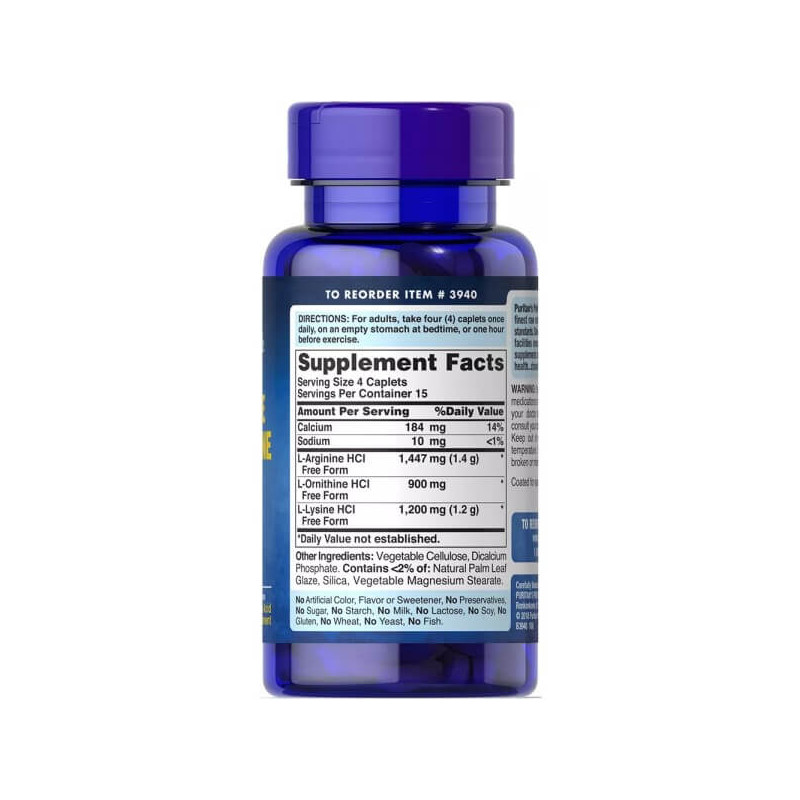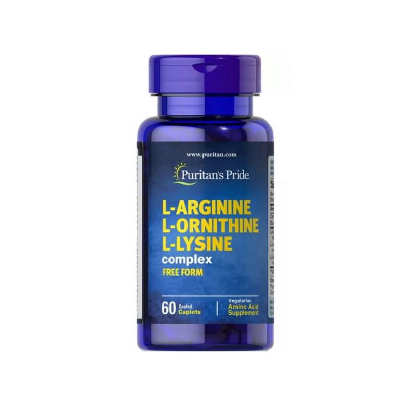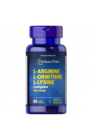 L-Arginine L-Ornithine L-Lysine – комплексна біоактивна добавка від відомого виробника із США Puritan's Pride, до складу якої входять незамінні амінокислоти аргінін, орнітин та лізин у продуманій оптимальній пропорції та добре засвоюваній вільній L-формі.