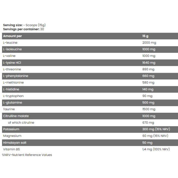 · по 1 г валіну, ізолейцину та малату цитруліну;