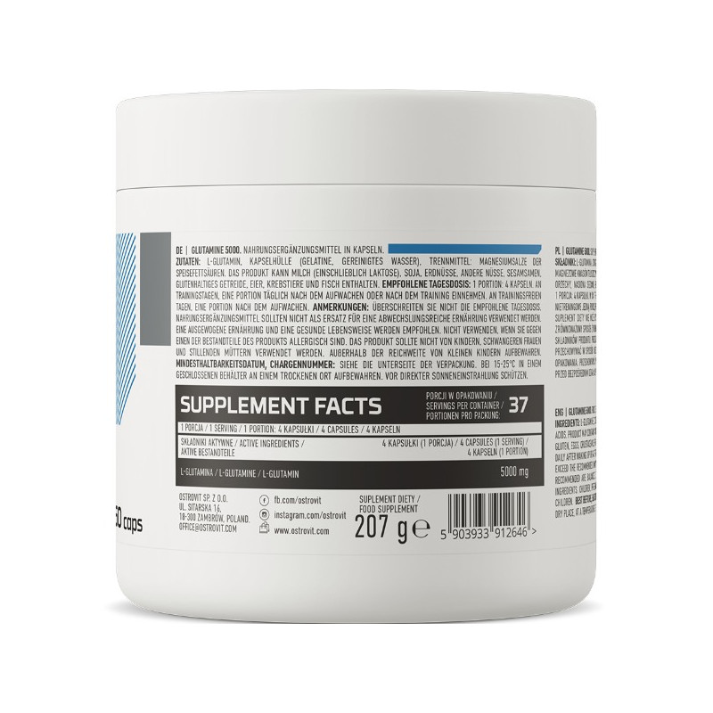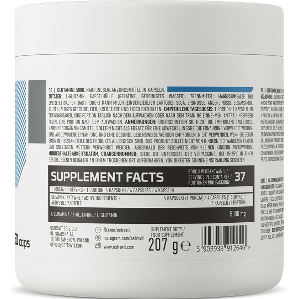 У складі OstroVit GLUTAMINE 5000 міститься 5000 мг чистого глутаміну в кожній капсулі. Це високе дозування робить продукт ефективним та концентрованим джерелом глутаміну для підтримки м'язів, імунної системи та загального фізичного благополуччя.