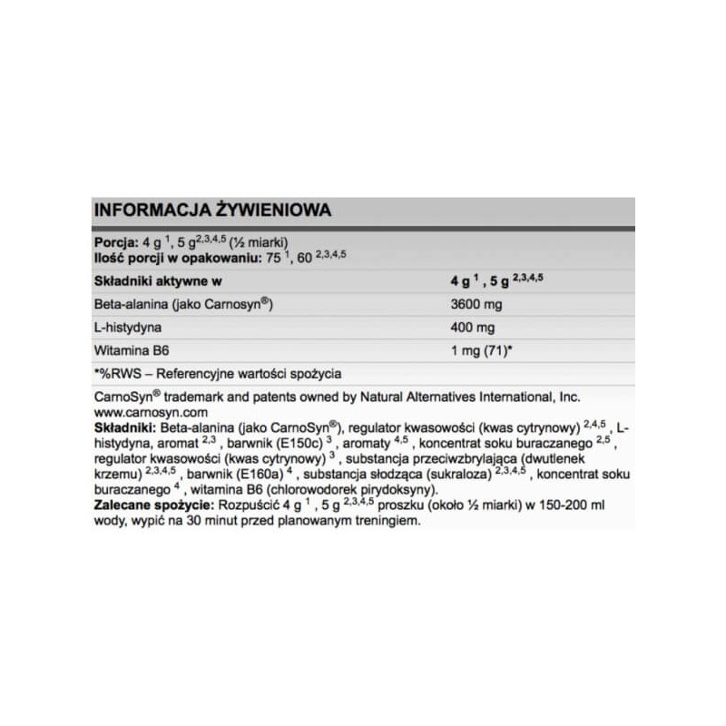 Beta-Alanine від виробника з Польщі Fitness Authority – передтренувальний комплекс з лінійки Performance Line, основним активним компонентом якого є амінокислота бета-аланін, представлена у вигляді унікальної авторської формули CarnoSyn. Вона органічно доповнена вільним гістидином та посилена вітаміном В6. Біодобавка реалізується у вигляді однорідного порошку, що чудово розчиняється в рідинах і не залишає після змішування грудок і осаду. Широке розмаїття смакових композицій дозволяє вибрати варіант за власним смаком та гастрономічним уподобанням.