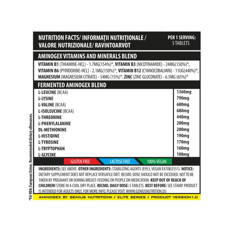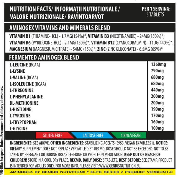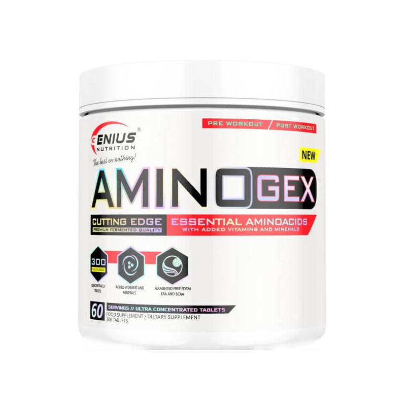 Aminogex від відомого європейського бренду Genius Nutrition – мультикомпонентний амінокислотний комплекс, до складу якого входять ферментовані незамінні амінокислоти ЕАА (9 позицій, у тому числі ВСАА), тирозин, гліцин, а також мінерали та вітаміни групи В12.