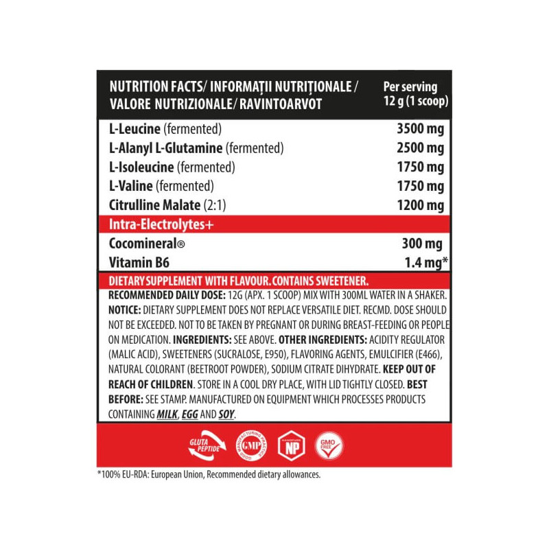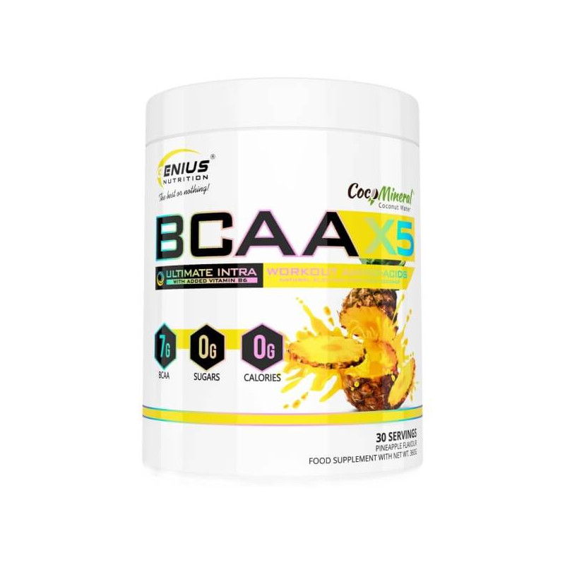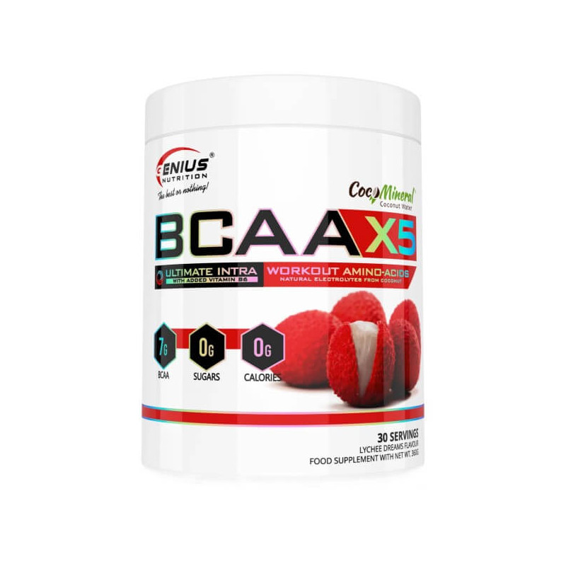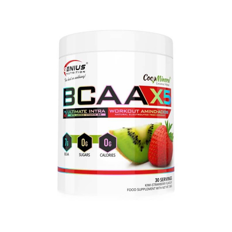 BCAA-X5 від відомого європейського бренду Genius Nutrition – ідеально складений комплекс незамінних амінокислот з розгалуженим бічним ланцюгом ВСАА у пропорції 2:1:1, посилений глютаміном, цитруліном, мінеральною електролітною кокосовою водою та вітаміном В6. Амінокислоти в цій домі представлені в підготовленій ферментованій формі, що забезпечує високу біодоступність. Порошкова суміш дозволяє швидко готувати корисні напої. А широкий асортимент смакових варіацій дає можливість робити ці напої смачними та різноманітними.