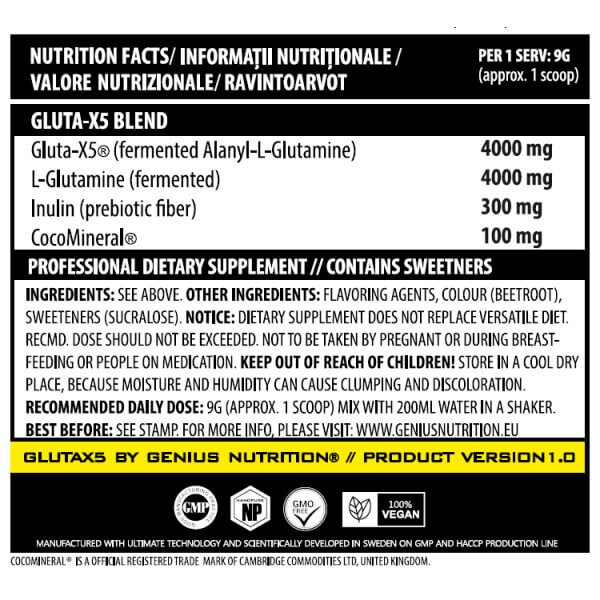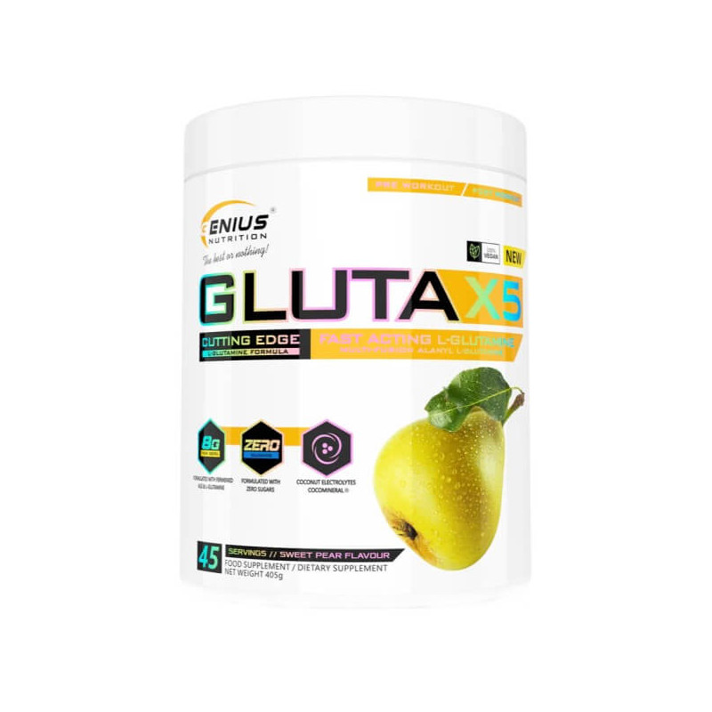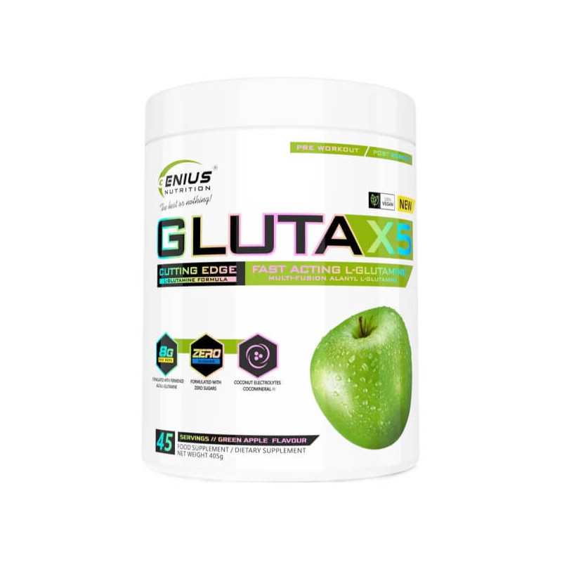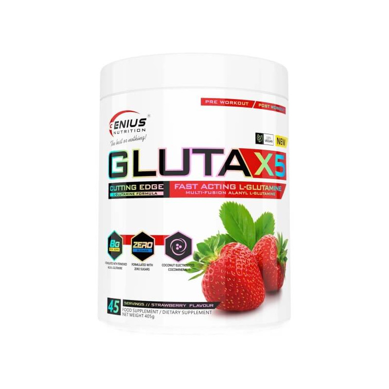 Gluta-X5 від компанії Genius Nutrition – комплексна біодобавка, до складу якої входить чистий ферментований глютамін, а також сполука L-аланіл-L-глютамін у вигляді авторської формули Gluta-X5, інулін та електролітна кокосова вода.