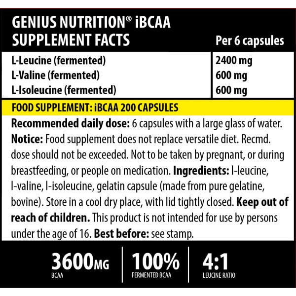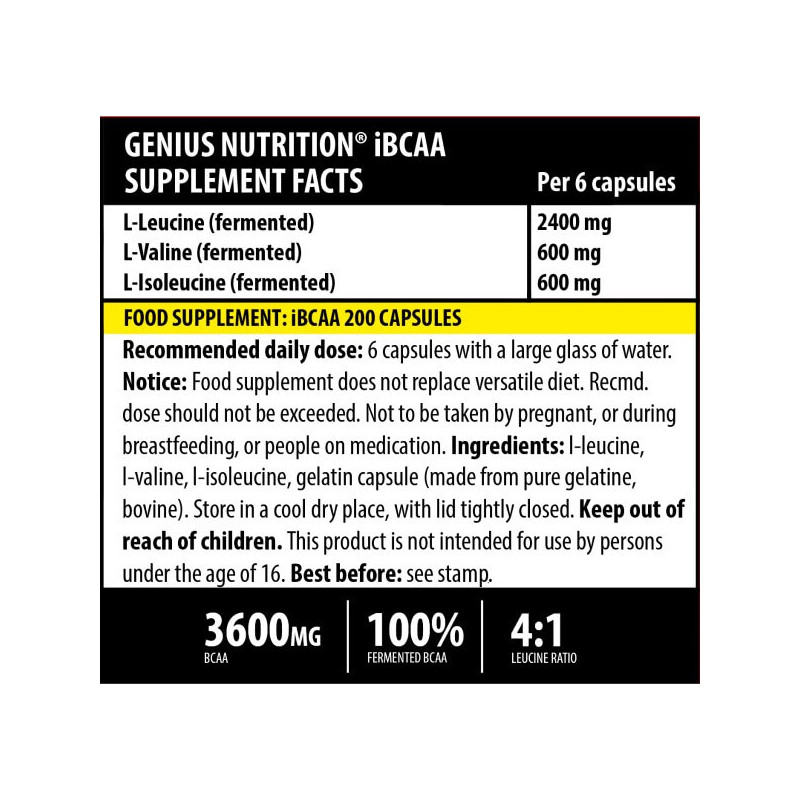 iBCAA – біоактивна добавка від популярного бренду зі Швеції Genius Nutrition, основними активними речовинами у складі якої є незамінні амінокислоти ВСАА – лейцин, ізолейцин та валін, представлені у пропорції 4:1:1. Вони отримані шляхом природної ферментації якісної сертифікованої натуральної тваринної сировини. Така технологія гарантує високу чистоту продукту, отже, його потужний позитивний ефект без побічних реакцій.
