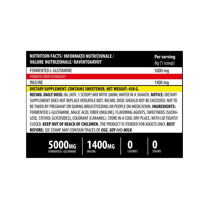 iGlutamine від шведського виробника Genius Nutrition – потужне джерело чистого вільного глютаміну, виготовленого з якісної натуральної сировини методом ферментації. Дана біодобавка не містить жиру, доданого цукру та штучних компонентів. А для ширшого позитивного впливу на організм до її складу введені неперетравлювані харчові волокна інулін, що мають виражений пребіотичний ефект.