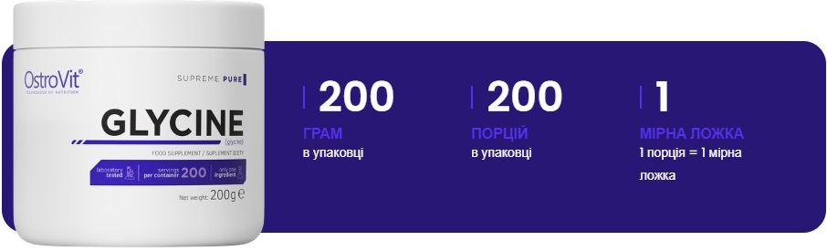 Головним інгредієнтом Glycine OstroVit є L-гліцин, чиста амінокислота, яка є будівельним блоком для білків у нашому організмі. Гліцин також може вироблятися в організмі від інших амінокислот або з його прекурсорів, таких як серин або треонін. Проте в разі недостатнього надходження гліцину з їжею або через внутрішню синтезуючу діяльність, його додаткове споживання у вигляді харчового додатку може бути корисним для забезпечення організму необхідною кількістю цієї амінокислоти.