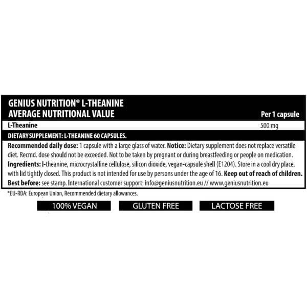 Важливо: L-Theanine від Genius Nutrition не містить у складі цукру, кофеїну, глютена, жирів та вуглеводів, будучи таким чином ідеально чистою добавкою з спрямованою дією.