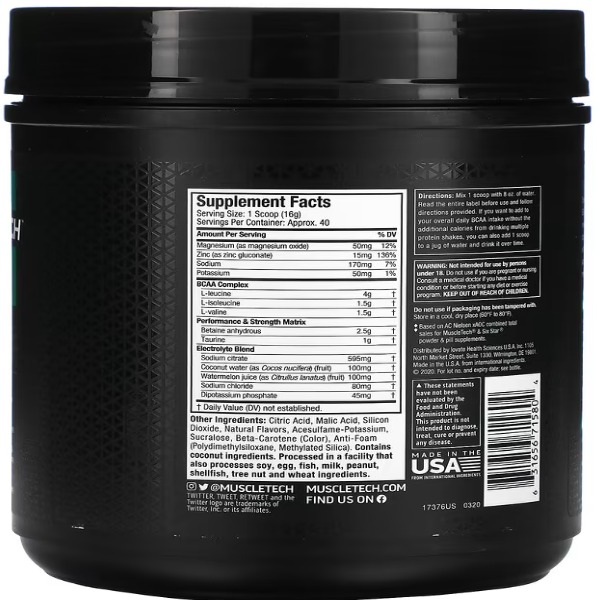 3. Комплекс Електролітів: Важливість електролітів для підтримки гідратації та оптимального функціонування організму під час тренувань важко переоцінити. Amino Build Muscletech включає в свій склад цитрат натрію, кокосову воду, арбузний сік, хлорид натрію та дикалій фосфат для підтримки балансу електролітів та запобігання дегідратації.