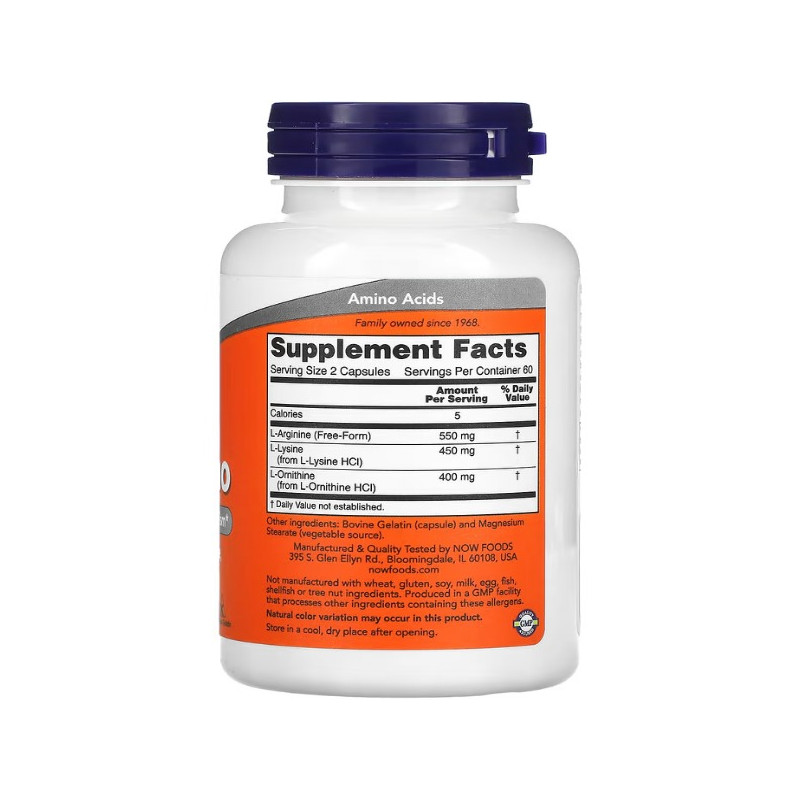 Tri-Amino від NOW Foods - це комплекс амінокислот, призначений для підтримки загального здоров'я і благополуччя організму. Продукт включає три ключові амінокислоти: L-аргінін, L-лізин і L-орнітин, кожна з яких відіграє важливу роль у підтримці різних фізіологічних функцій.