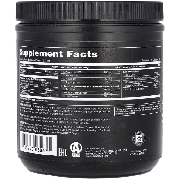 Juiced Aminos Universal Nutrition Animal - це інноваційна амінокислотна формула, спеціально розроблена для атлетів і бодібілдерів, які прагнуть досягти максимальних результатів у тренуваннях і відновленні. Цей потужний комплекс містить ключові амінокислоти з розгалуженим ланцюгом (BCAA), а також інші незамінні амінокислоти та додаткові активні компоненти, що забезпечують підтримку м'язового росту, відновлення та покращення продуктивності.