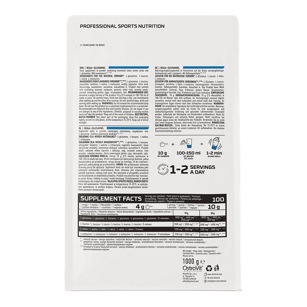 Добавка, поєднує в собі амінокислоти з розгалуженими ланцюгами (BCAA) та глютамін, щоб забезпечити максимальну підтримку для м'язів під час тренувань. Продукт містить 1000 грамів порошку, що складається з L-лейцину, L-ізолейцину та L-валіну у співвідношенні 2:1:1, а також L-глютаміну, який сприяє швидкому відновленню після фізичних навантажень. Ця комбінація допомагає зменшити м'язовий катаболізм, підвищити витривалість та підтримати синтез білка.