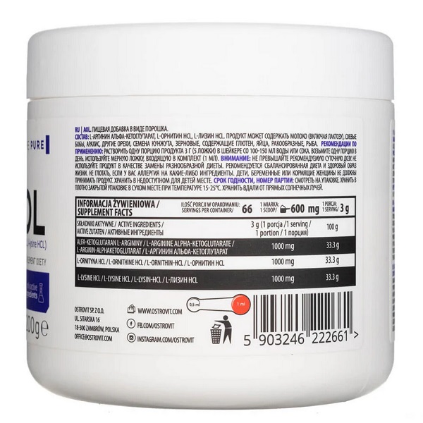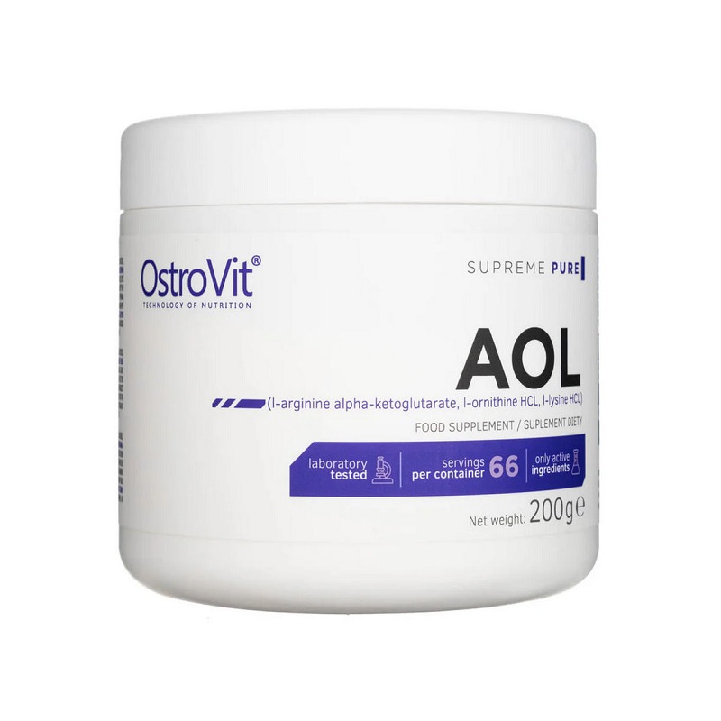OstroVit AOL Pure — це спортивна добавка, що містить аргінін, орнітин і лізин для підтримки відновлення м'язів і підвищення спортивних результатів. Вона сприяє покращенню кровообігу, зниженню втоми та пришвидшує регенерацію після тренувань. Продукт ідеально підходить для активних людей та спортсменів.