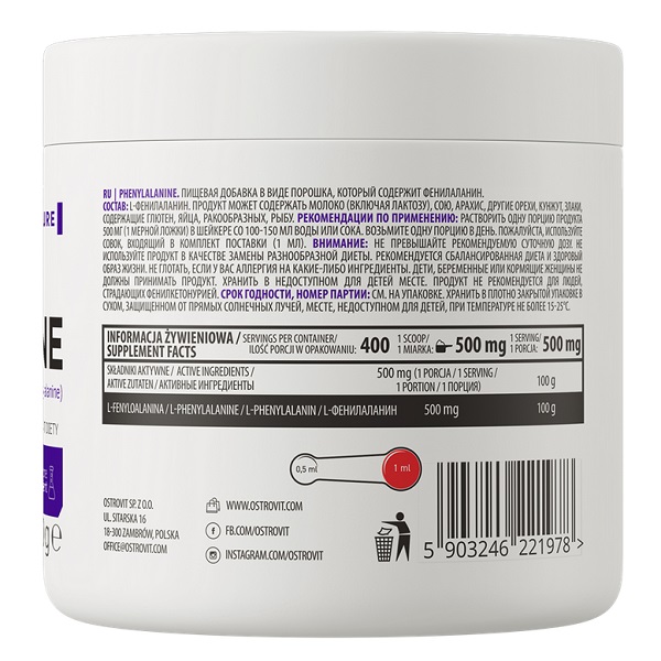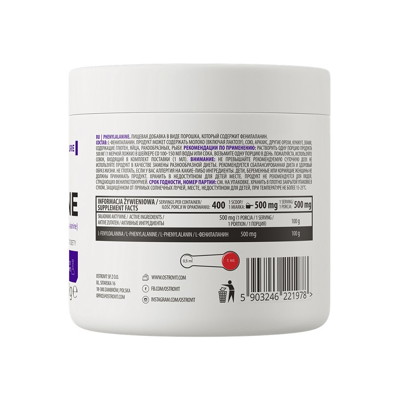 Phenylalanine OstroVit — це дієтична добавка, яка містить високоякісну амінокислоту фенілаланін, необхідну для виробництва білків в організмі. Вона сприяє підтримці належного функціонування нервової системи та покращенню настрою. Ідеально підходить для спортсменів і людей, які прагнуть підтримати своє загальне здоров'я та самопочуття.