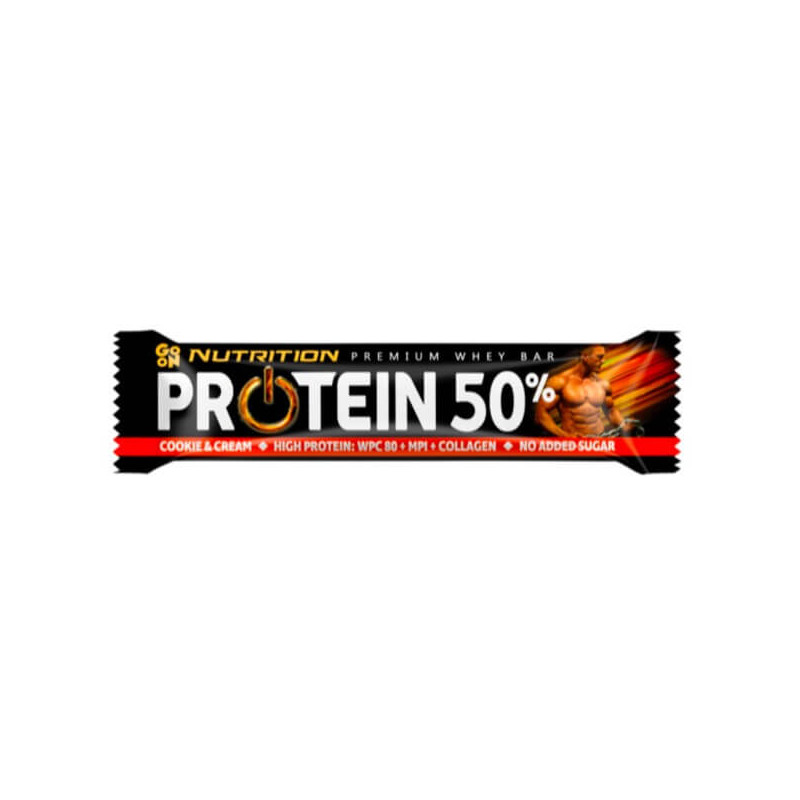 Go On Protein Bar 50% – корисний та ситний протеїновий батончик від польського виробника Go On Nutrition. Його нутрієнтну основу становить високоочищений ізолят сироваткового протеїну. Насичені жири та швидкі вуглеводи у складі містяться в мінімальній кількості. Його калорійність складає 161 кк - достатньо для насичення і замало для того, щоб поповнити жирові відкладення. А ніжний смак печива з вершками і пластівці какао у складі роблять продукт ще й дуже смачним.