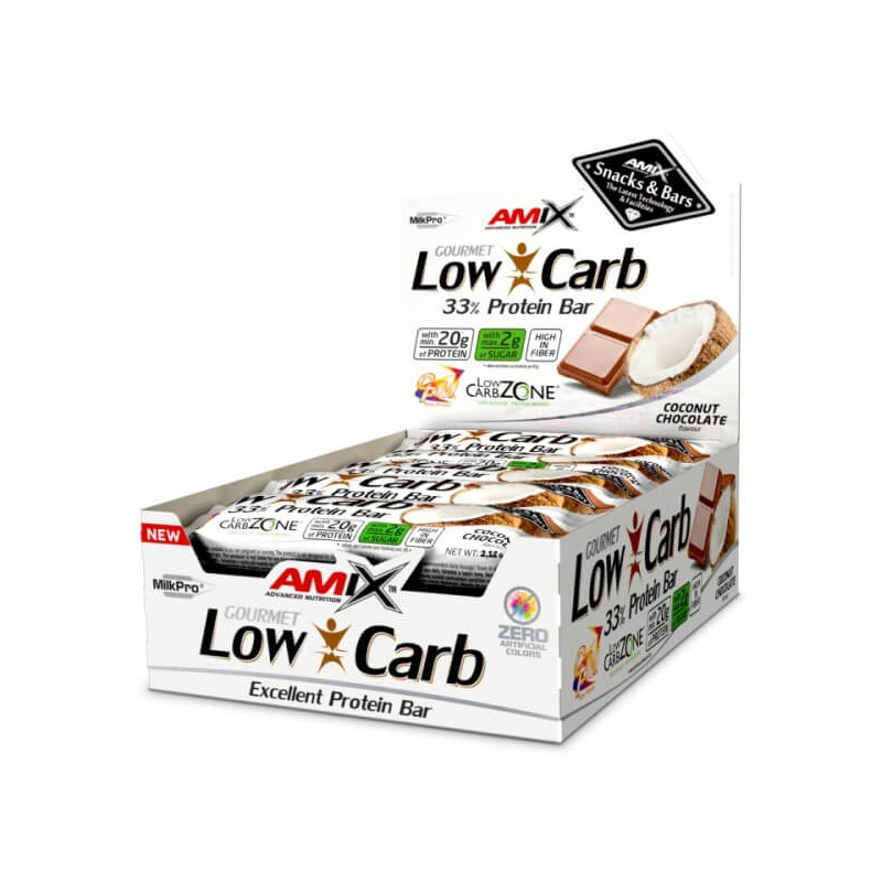 Low-Carb 33% Protein Bar від одного з найкращих європейських брендів спортивного харчування Amix – батончик з високим процентним вмістом протеїнів та мінімальною кількістю простих вуглеводів. У ньому присутня унікальна матриця MilkPro Protein Blend, що складається з ізолятів та концентратів білків із цільного молока та молочної сироватки. Також до складу продукту входять очищені харчові волокна, корисні жири та мальтитол у вигляді сиропу з різними смаками.
