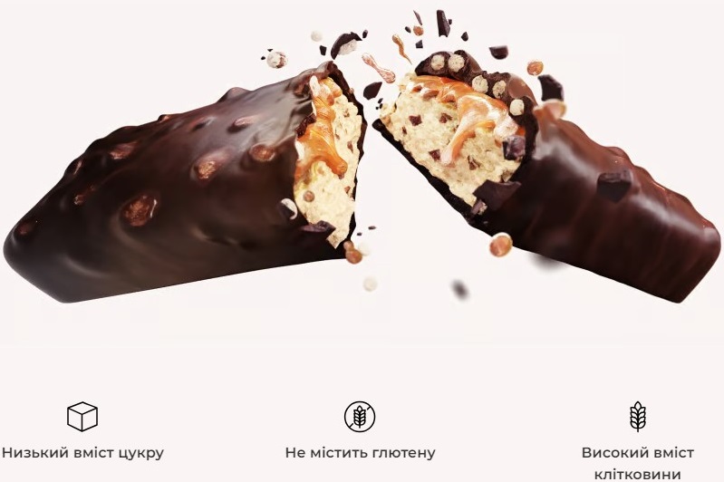 Арахісове масло: молочний білок, молочний шоколад 20% (підсолоджувач мальтит, масло какао, какао терте, сухе молоко , какао, емульгатор соняшниковий лецитин), зволожувач гліцерин, пептиди колагену, олігофруктоза, полідекстроза, соняшникова олія, екструдат ( ізолят соєвого білка, тапіока). крохмаль, сіль), сухе знежирене молоко , вода, арахіс 1,5%, ароматизатор, рослинний жир (пальмоядровий, пальмовий, ши), емульгатори лецитин ріпаковий, натрію хлорид, барвник Е 150с, емульгатор натрію цитрат, підсолоджувач сукралоза, барвник Е 160b.