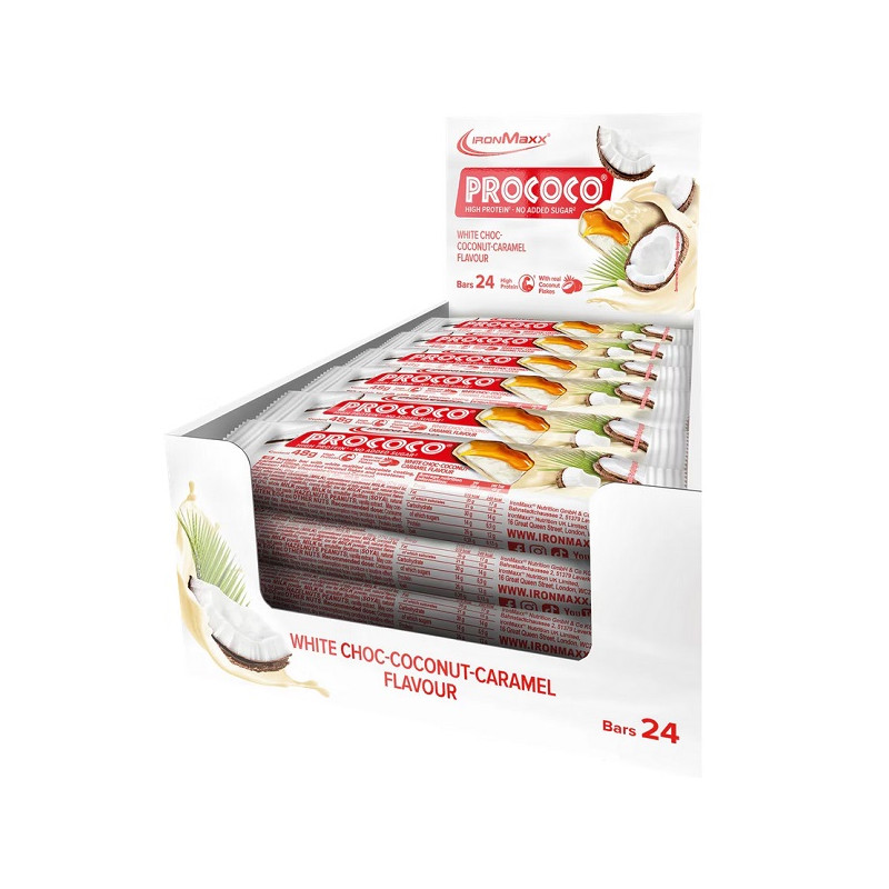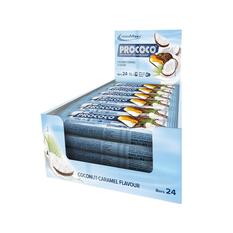 Prococo IronMaxx — кокосовий протеїновий батончик для швидкого перекусу. Він містить високий вміст білка. Підходить для активних людей і спортсменів. Може використовуватися після тренування. Має зручний формат 48 г. Упаковка містить 24 батончики. Є практичним джерелом енергії та білка.