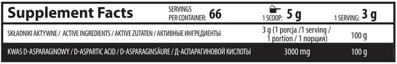 D-аспаргіновая кислота впливає на гіпоталамус, що провокує звільнення ряду гормонів: зростання, фолікулостімуляціі і лютеінозірующего. Ці речовини відповідають за витривалість і дозволяють сформувати гарний рельєф за короткі терміни.