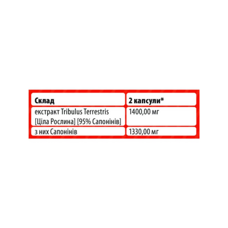 У разовій порції спортивної добавки-бустера Tribulus Max від Sporter, що складається з 2 капсул, міститься: