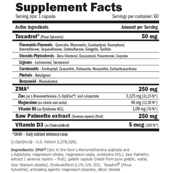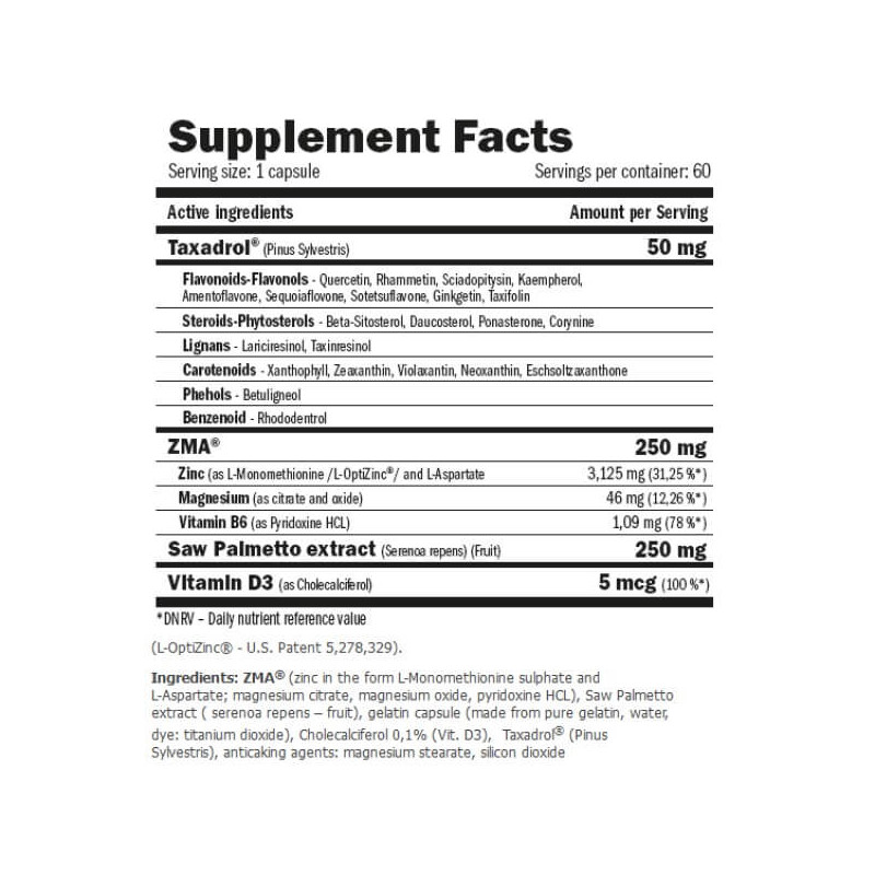· 50 мг унікальної фірмової формули Taxadrol з флавоноїдами, фітостеролами, лігнанами, фенолами, каротиноїдами;