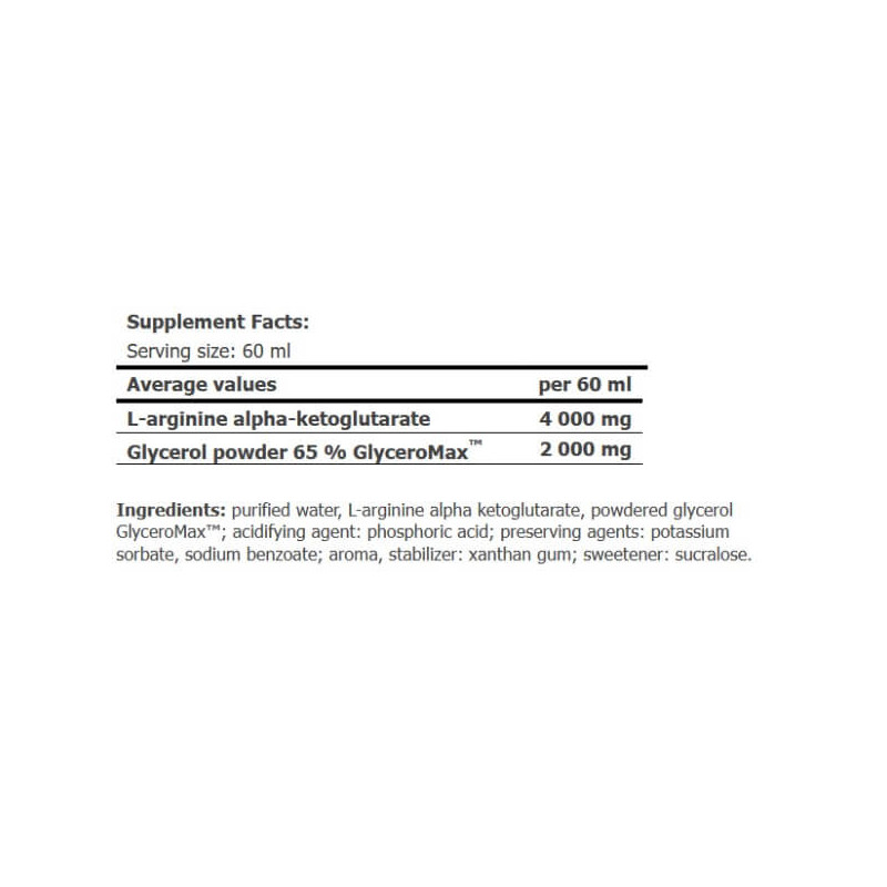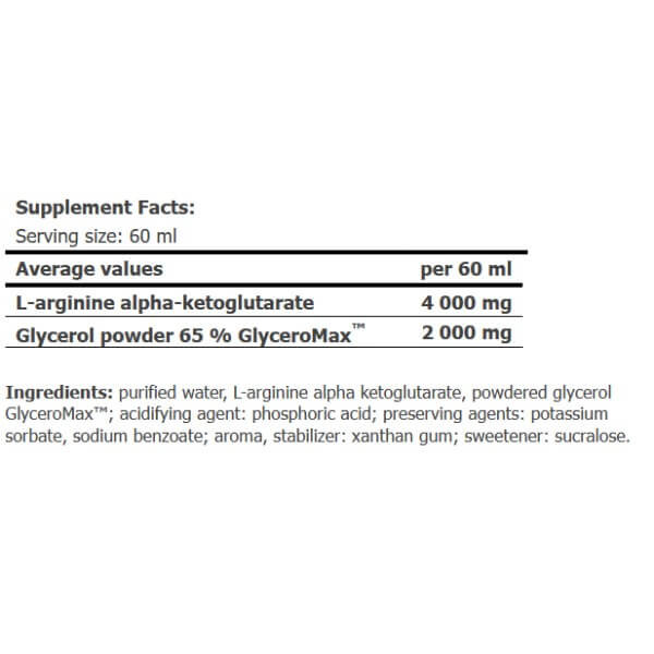 AAKG Shot від відомого англійського бренду спортивного харчування Amix - L-аргінін альфа-кетоглутарат (ААКГ), представлений у рідкій формі та посилений порошком гліцерину у вигляді запатентованої фірмової формули Glycerol GlyceroMax.