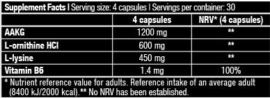 L-аргініну альфа-кетоглутарат, L-орнітину гідрохлориду, оболонка капсули [желатин, барвники (діоксид титану, чорний оксид заліза)], L-лізин, антизлежувач (діоксид кремнію, натрій карбоксиметилцелюлоза), пірідоксінагідрохлорід) . Виготовлено на підприємстві, яке виробляє продукти, що містять молоко, сою, яйця і гірчицю.