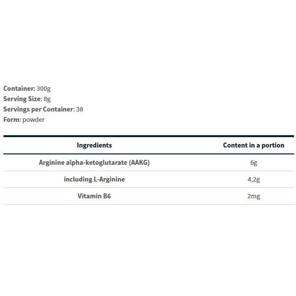 A-AKG з ексклюзивної лінійки Performance Line, розробленої популярним польським брендом Fitness Authority – біодобавка, активною речовиною у складі якої є альфа-кетоглутарат L-аргініну. З'єднання з кетоглутарової кислотою дозволяє аргініну засвоюватися організмом приблизно в півтора рази краще, ніж у чистому вигляді. Для посилення ефекту до складу введено вітамін В6.