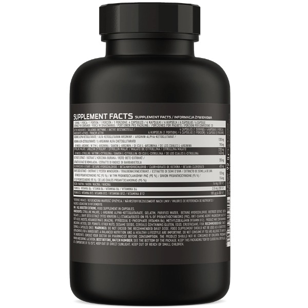 Цитрулін малат, L-аргінін альфа-кетоглутарат, желатин, вода очищена, бетаїн гідрохлорид, екстракт кореня буряків (Beta vulgaris L.), екстракт виноградних кісточок (Vitis vinifera L.), стандартизований до 95% проантоціанідинів (PAC), магнієві солі жирних кислот; інозитол гексанікотинат (ніацин), піридоксало-5'-фосфат (вітамін В6), метилкобаламін (вітамін В12).