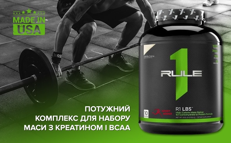 Ідеальний склад для набору м'язової маси від американської компанії Rule One. Допоможе наростити м'язи навіть людям з швидким обміном речовин і ектоморфним типом статури.
