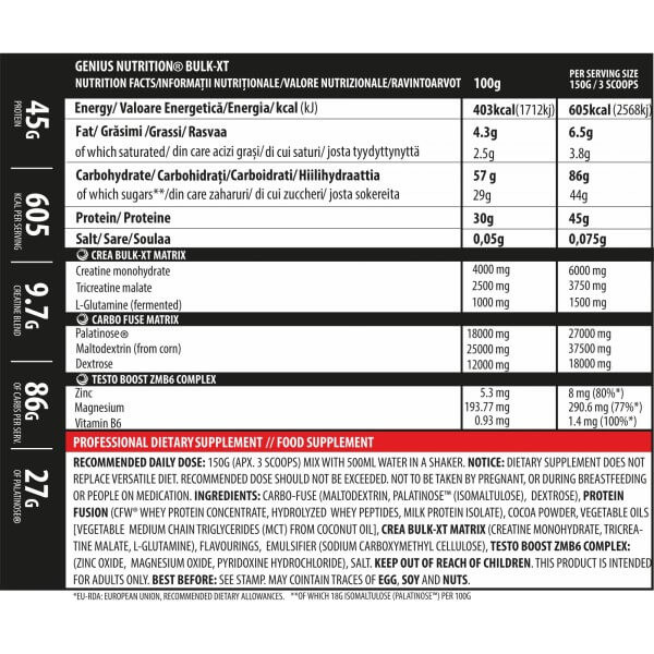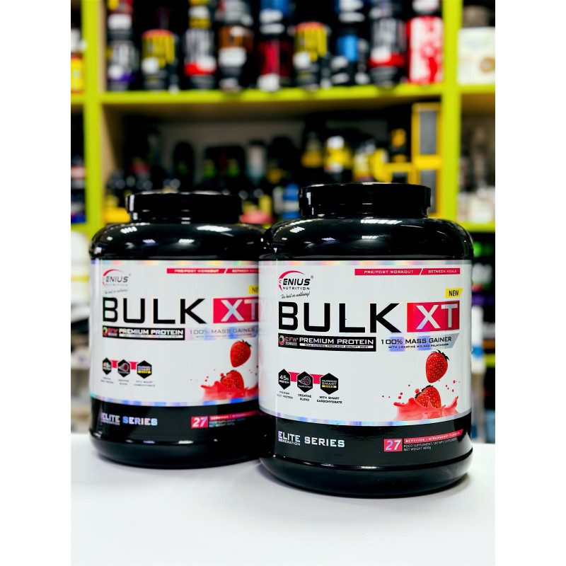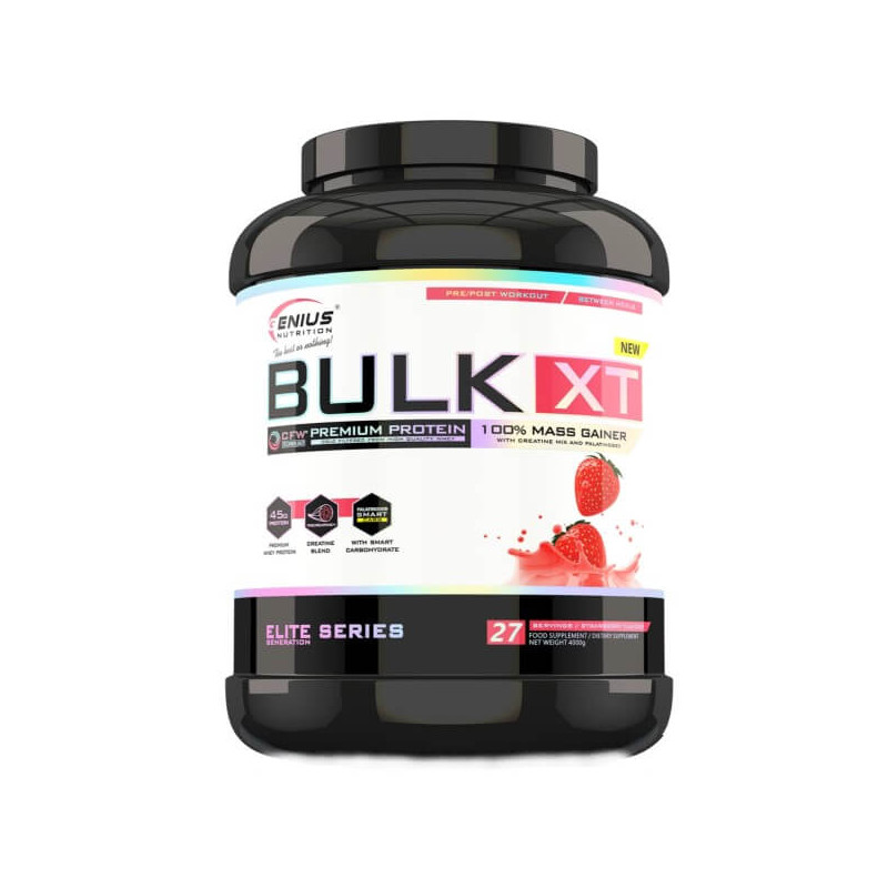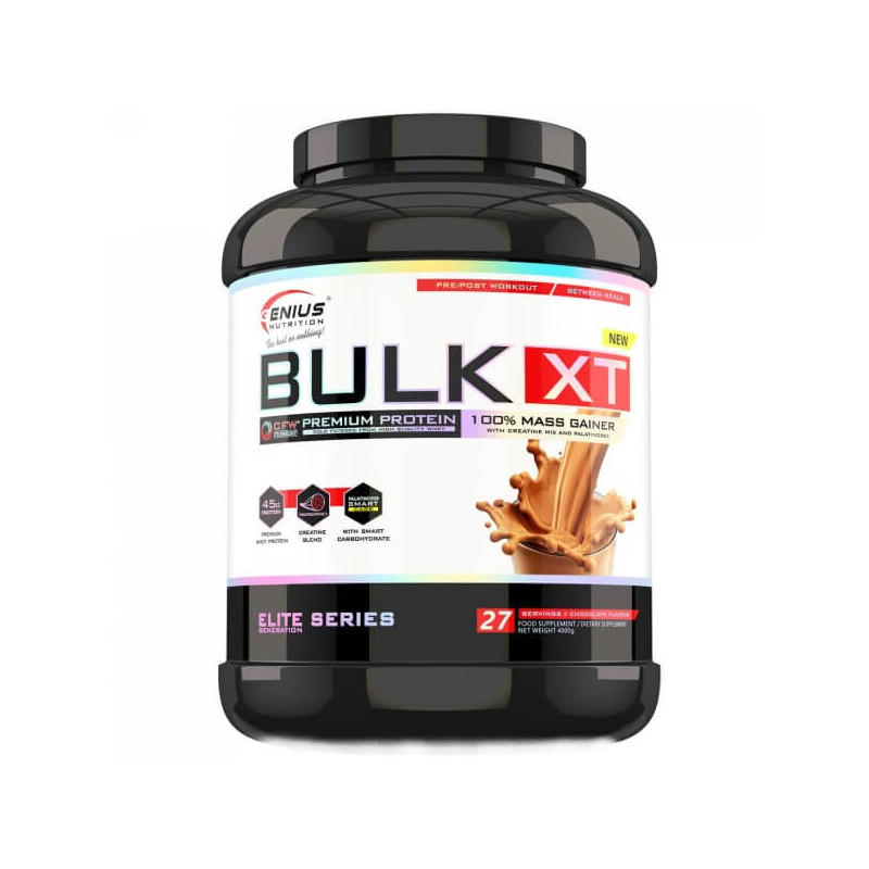 Bulk-XT від європейського виробника Genius Nutrition – ідеально збалансований гейнер з високим вмістом якісних білків та швидкозасвоюваних вуглеводів. До його складу входять палатиноза, декстроза та мальтодекстрин, концентрат та ізолят сироваткового білка, збагачені пептидами, дві форми креатину, глютамін, а також магній, цинк та вітамін В6.
