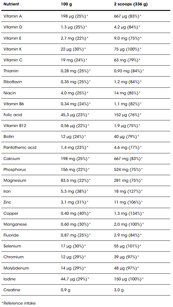 Збагачений вітамінами і мінералами: Підтримує загальне здоров'я організму і допомагає заповнити дефіцит поживних речовин.
