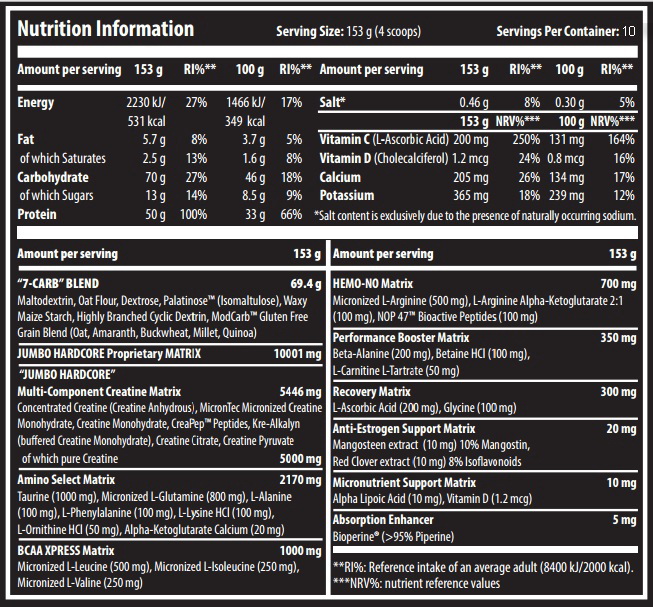 Scitec Nutrition Jumbo Hardcore ідеально доповнить раціон атлетів, які шукають джерело додаткової енергії для нарощування мязової маси і поліпшення силових показників.