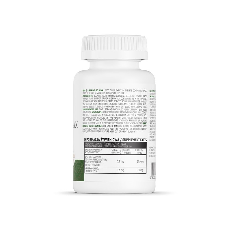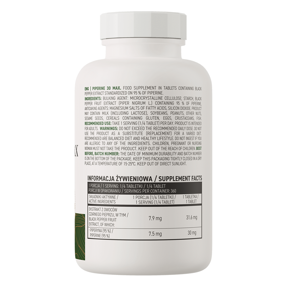 Piperine Max від польського виробника OstroVit – потужна натуральна біоактивна добавка, основним компонентом якої є чорний пекучий перець. У плодах цієї рослини міститься велика кількість піперину – алкалоїду, який відповідає за активізацію низки метаболічних процесів в організмі. У БАДі від компанії "Островіт" його концентрація досягає 95%.