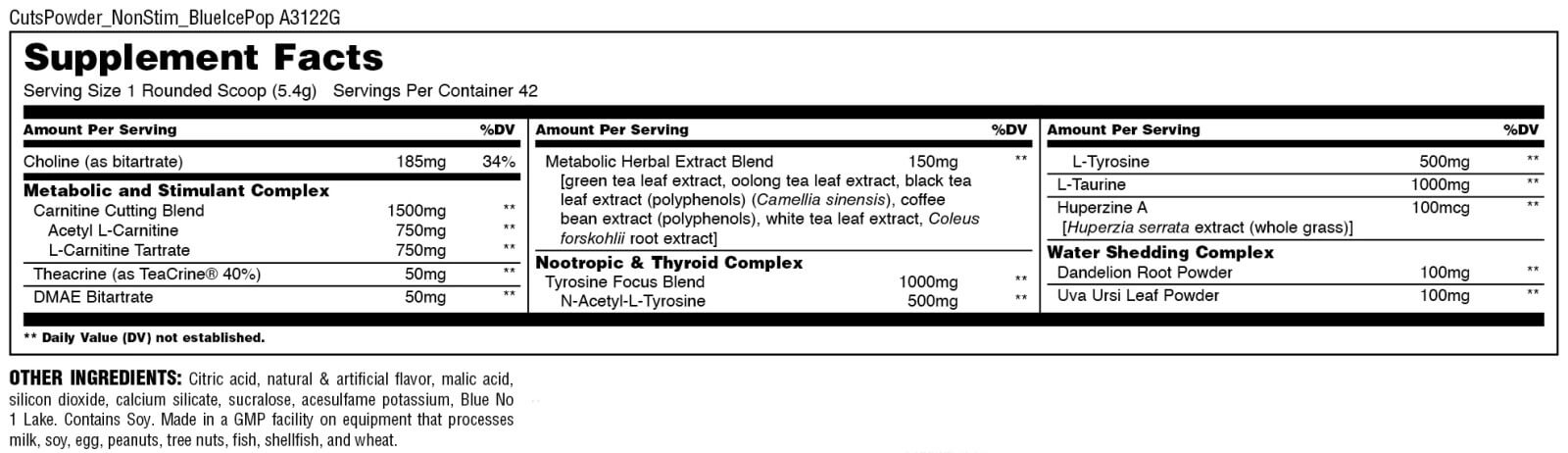 Cuts Non-Stim Powder підтверджено реальними дослідженнями інгредієнтів, які дійсно допомагають спалювати жир без додавання кофеїну. Продукт базується на нашій суміші Carnitine Cutting Blend, яка складається з ацетил-L-карнітину та L-карнітину тартрату, двох форм карнітину, які мають доведений досвід у зменшенні жирових клітин.