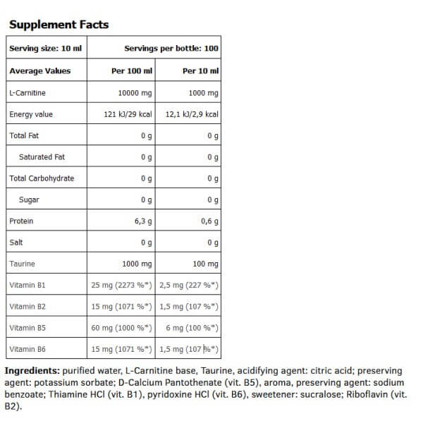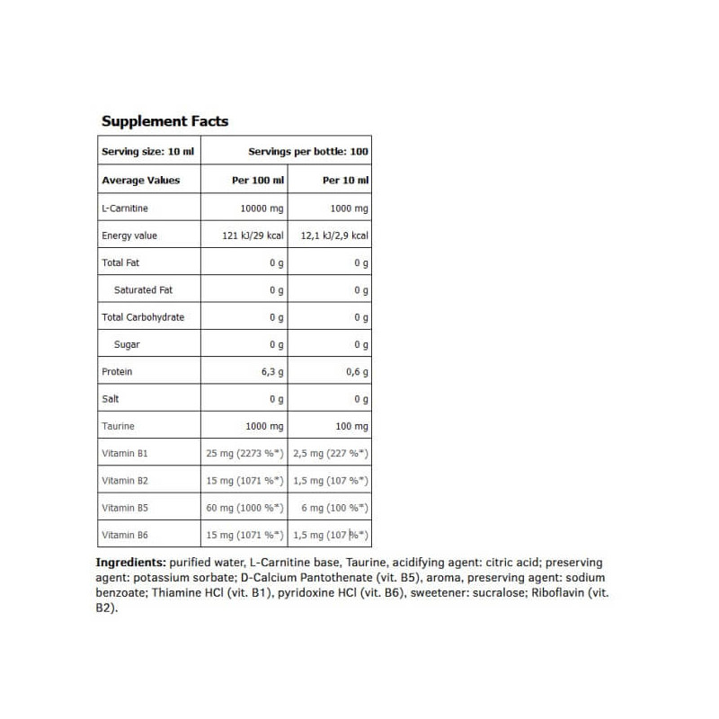 У порції продукту Carnitine+100.000 mg CarniZone від Amix об'ємом 10 мл міститься: