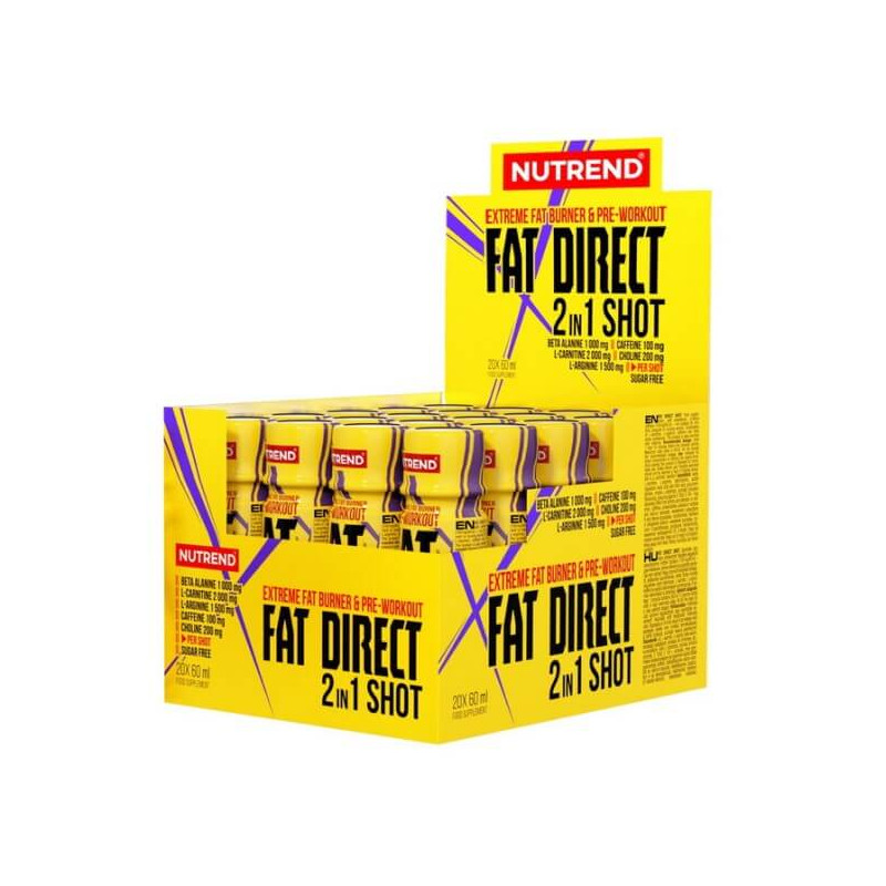 Fat Direct 2 in 1 Shot від популярного чеського бренду Nutrend – унікальна харчова добавка, що органічно поєднує в собі властивості предтреніка та жироспалювача. З точки зору нутрієнтного складу вона являє собою комплекс амінокислот, вітамінів, холіну, кофеїну та природної органічної сполуки глюкуронолактону. Всі компоненти отримані з високоочищеної натуральної сировини, що дозволяє говорити про відсутність побічних реакцій та формування залежності навіть при тривалому прийомі біодобавки.