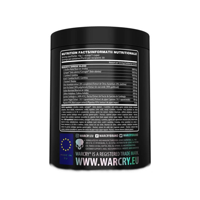 Warcry Shredz від популярного європейського бренду Genius Nutrition – симбіоз жироспалювача та передтреника, вдало реалізований в одному біоактивному комплексі. До складу цього продукту входять амінокислоти, рослинні екстракти, а також кофеїн. Усі інгредієнти отримані з природної сертифікованої сировини, зібраної в екологічно благонадійних місцевостях, що пройшла ретельне очищення.