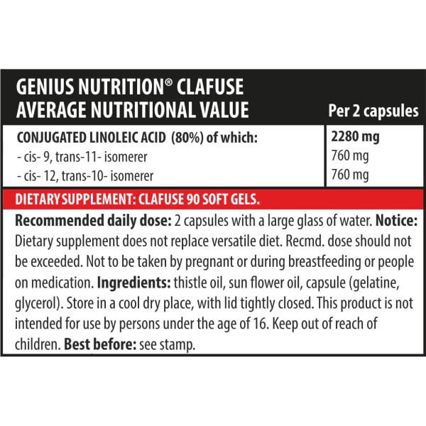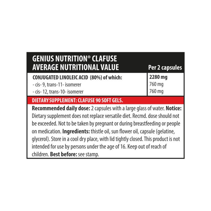 CLAfuse від легендарного бренду з Європи Genius Nutrition – потужний жироспалювач природного походження на основі кон'югованої лінолевої кислоти. Ця поліненасичена жирна кислота є однією з найефективніших модифікацій Омега 6. Вона відіграє важливу роль у багатьох процесах життєдіяльності, при цьому організмом не виробляється, тому дуже важливо регулярно отримувати її ззовні. Тим, хто не може робити це за рахунок продуктів харчування – молочних, м'ясних та деяких рослинних – ми пропонуємо звернути увагу на збалансовану безпечну добавку в капсулах.